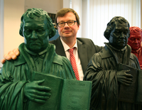 PD Dr. Albrecht Geck mit den sog. Lutherzwergen von Ottmar Hörl.